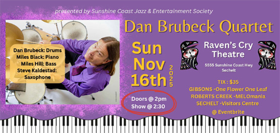 'Dan Brubeck Quartet'![]() Sunday, November 16 2025 Raven's Cry Theatre, Sechelt Doors 2:00pm : Showtime 2:30pm Tickets : $35 from Eventbrite online click here One Flower One Leaf, Gibsons; MELOmania, Roberts Creek Sechelt Visitor Centre or in person at the door |